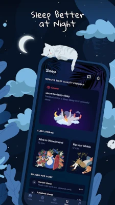 Relax with soothing stories and mellow sounds to enhance your sleep quality and unwind after a long day.